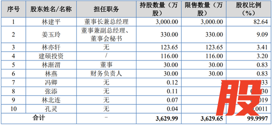 林建平直接持有公司3,000万股股份,占公司总股本的82.64%,姜玉玲直接持有公司330万股股份,占公司总股本的9.09%。林建平持有建硕投资0.01%的出资份额,系建硕投资执行事务合伙人,并通过建硕投资控制公司116万股股份,占公司总股本的3.20%。林建平为公司的控股股东,林建平、姜玉玲夫妇合计控制公司94.93%的股份,为公司的共同实际控制人。
