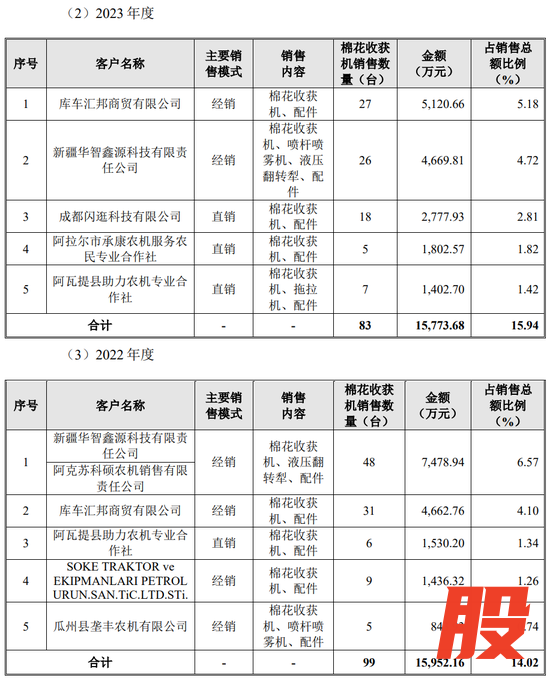 报告期前两年,公司前五大客户主要为棉花收获机的经销商和农民专业合作社,农民专业合作社为棉花收获机的终端用户,购买产品主要用于经营,如向棉农提供采收服务,公司客户集中度较为分散,主要是因为棉花收获机单价较高且经销商销售台数较少,除经销商和农民专业合作社外的绝大多数直接客户采购数量均为1台。2024年度发行人客户集中度较高,主要系向乌兹别克斯坦的客户销售了300台四行箱式机。