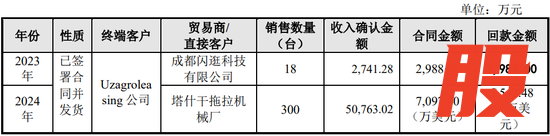 公司2023年销至成都闪逛的18台机器以及2024年销至Tashkent TraktorZavodi(以下简称“塔什干拖拉机械厂”)的300台机器,均最终销往Uzagroleasing Joint Stock Company(以下简称“Uzagroleasing公司”),其具体情况如下: