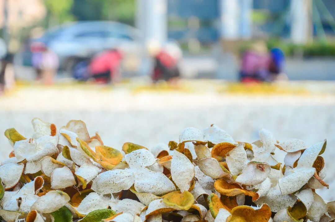 陈皮的陈,以三年为界。经采摘、开皮、反皮、晒制,而后陈化。陈皮陈化需要保持干燥,又不可曝晒,秋高气爽的季节最适合翻晒陈皮。因此,每年秋季到访新会,便总能看到家家户户在路边翻晒陈皮、柑香遍地的新奇景象。