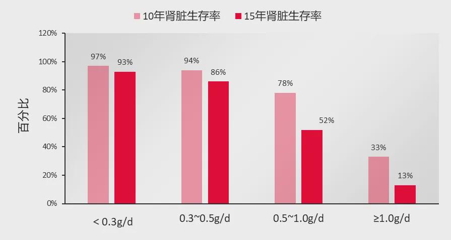 图 2 不同蛋白尿水平 IgA 肾病患的肾脏结局[3]