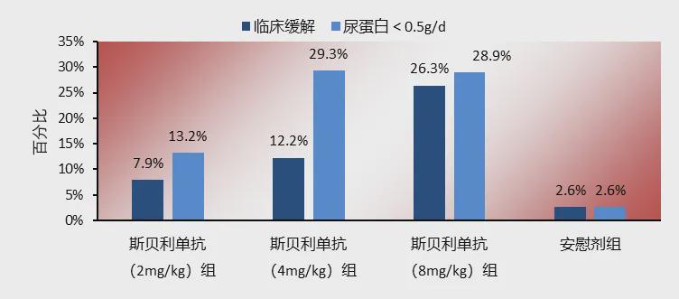 改善蛋白尿:斯贝利单抗2 mg/kg、4 mg/kg、8 mg/kg组第12个月时24小时uPCR分别较基线降低 34%、48.5%、52.5%,相当一部分患者达到临床缓解和尿蛋白<0.5 g/d。