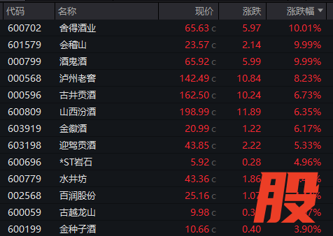 酒类股盘中强势拉升,截至收盘,舍得酒业、酒鬼酒、会稽山涨停,泸州老窖涨超8%,古井贡酒、山西汾酒涨超6%。
