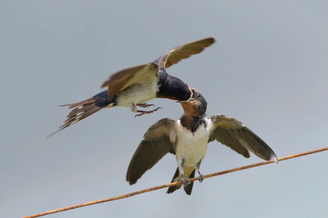 家燕亲鸟给已经出巢的雏鸟进行育雏/黄文铭 摄